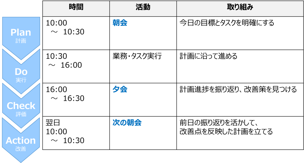 - 目的:各メンバーが「今日やること」を明確にし、チーム全体で共通認識を持つ