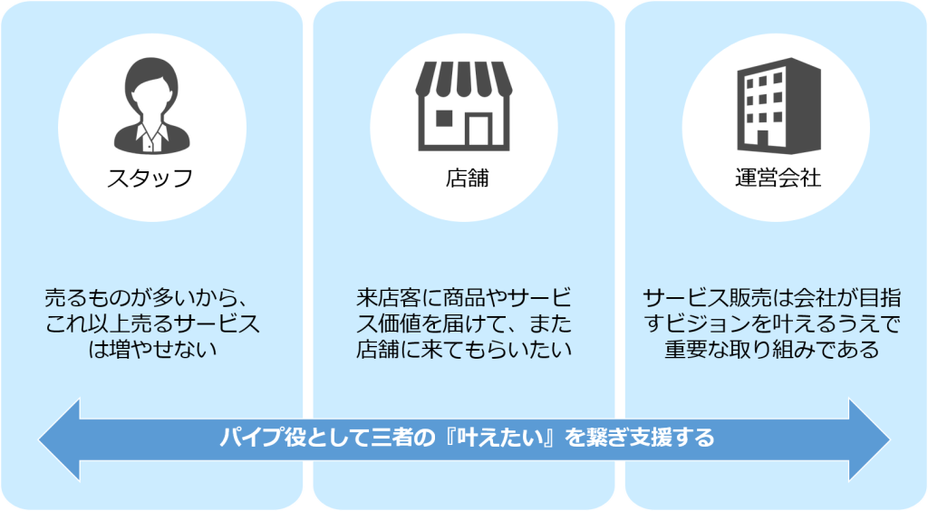 店舗スタッフ1人1人を見れば、「売るものが多いから、これ以上売るサービスは増やせない」という人もいる。ただ、店舗の意向に目を向けてみると、「来店客に商品やサービス価値を届けて、また店舗に来てもらいたい」と考えている。そして、店舗の運営会社であれば、「サービス販売は会社が目指すビジョンを叶えるうえで重要な取り組みの一部である」と考えていることを知りました。